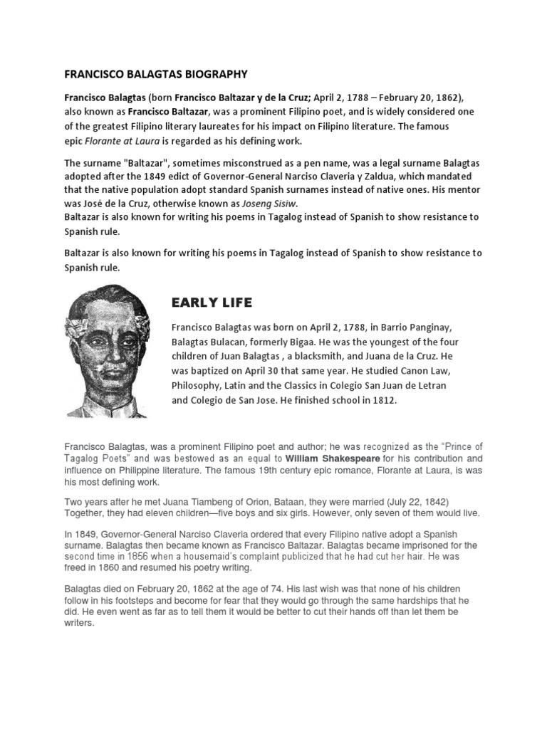 His parents were a blacksmith Juan Baltazar and Juana de la Cruz. Born in 1788 in Bulacan Francisco Balagtas is rightly seen as one of the literary greats of the Philippines a prolific romantic poet known for his epic Florante at Laura. He is widely known by his pen name Francisco Balagtas.